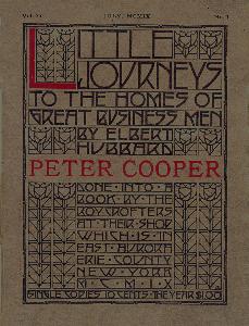 From the beginning, Cooper Union also provided a public reading room and library and a meeting place for artists and inventors. Abraham Lincoln gave his "Right Makes Might" speech from the Great Hall podium, assuring him the Presidency. The reproduction at the left shows the cover of the 1909 book about Peter Cooper in the "Little Journeys to the homes of great business men" series, by Elbert Hubbard. The text, which is fascinating reading, is available