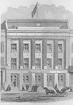 The institute, founded in 1823 as the Apprentices' Library, started with 724 volumes and 150 pamphlets, contributed by citizens who carted them in wheelbarrows to the reading room at 143 Fulton Street. Soon a site was obtained for a new building at Cranberry and Henry Streets, and on July 4, 1825, the cornerstone was laid by General Lafayette, on his last visit to America. In 1843, the library, then in a building on Washington Street, was reorganized as the Brooklyn Institute for the purpose of "enlarging the knowledge in literature, science, and art." After it was reorganized by its director, Franklin W. Hooper, and merged with other societies, the institute was incorporated in 1890 under its present name. |