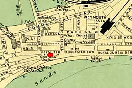 Carte du bord de mer de Weymouth montrant le quartier autour de la statue de George III et l'endroit d'où cette photo a été prise.